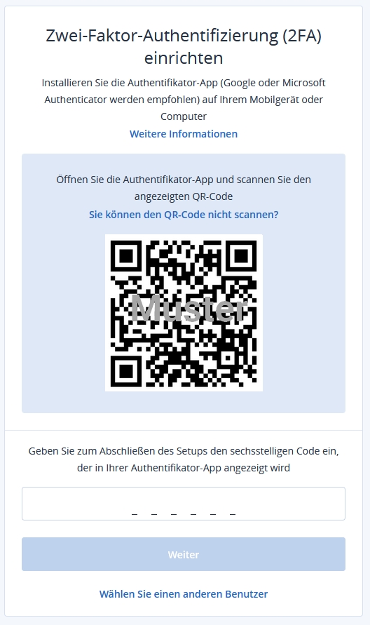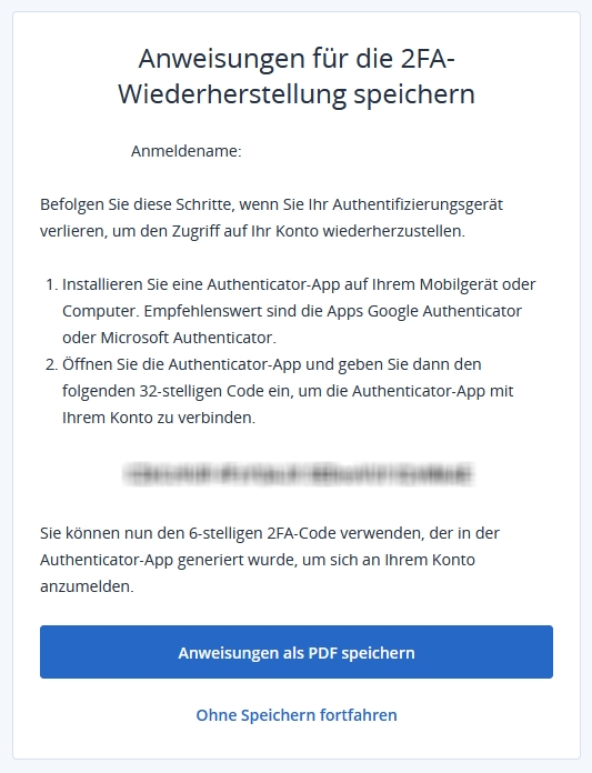 Important: it is strongly recommended that you save the instructions for the 2FA recovery. During setup, you have the option of saving them locally as a PDF. Alternatively, you can also print out the QR code or take a screenshot and save it.